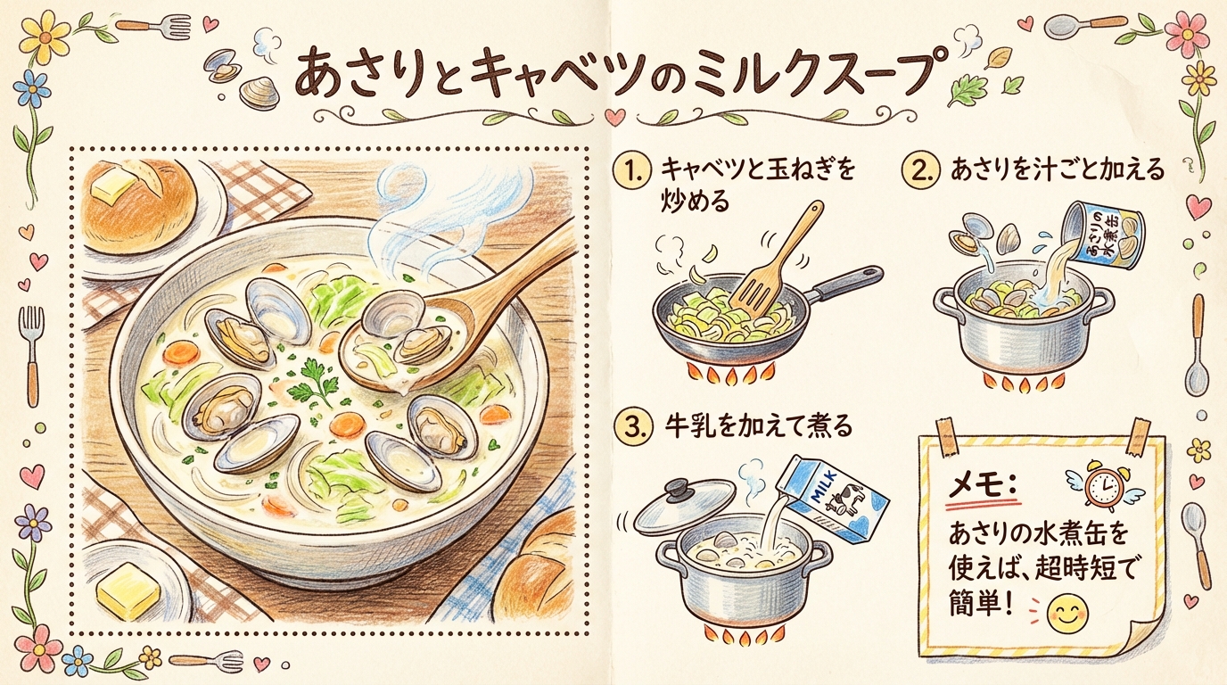 あさりの水煮缶を使うことで大幅な時短になり、活力を生むミネラル(亜鉛・鉄分)と牛乳のカルシウムをスープごと余さず摂取できる優秀な一品です。