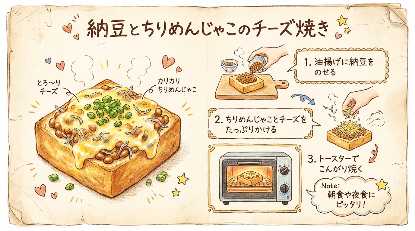 油揚げ(または食パン)の上に、タレを混ぜた納豆と、しらす(ちりめんじゃこ)を乗せます。上からとろけるチーズをたっぷりとかけ、トースターでチーズに焦げ目がつくまで焼きます。 - ポイント