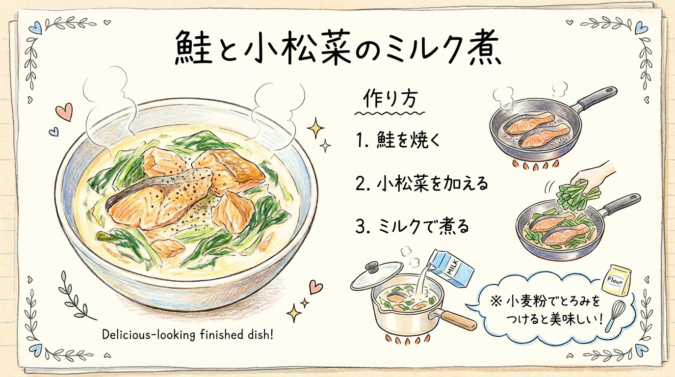 レシピ1:鮭と小松菜のミルク煮(カルシウム×ビタミンD)