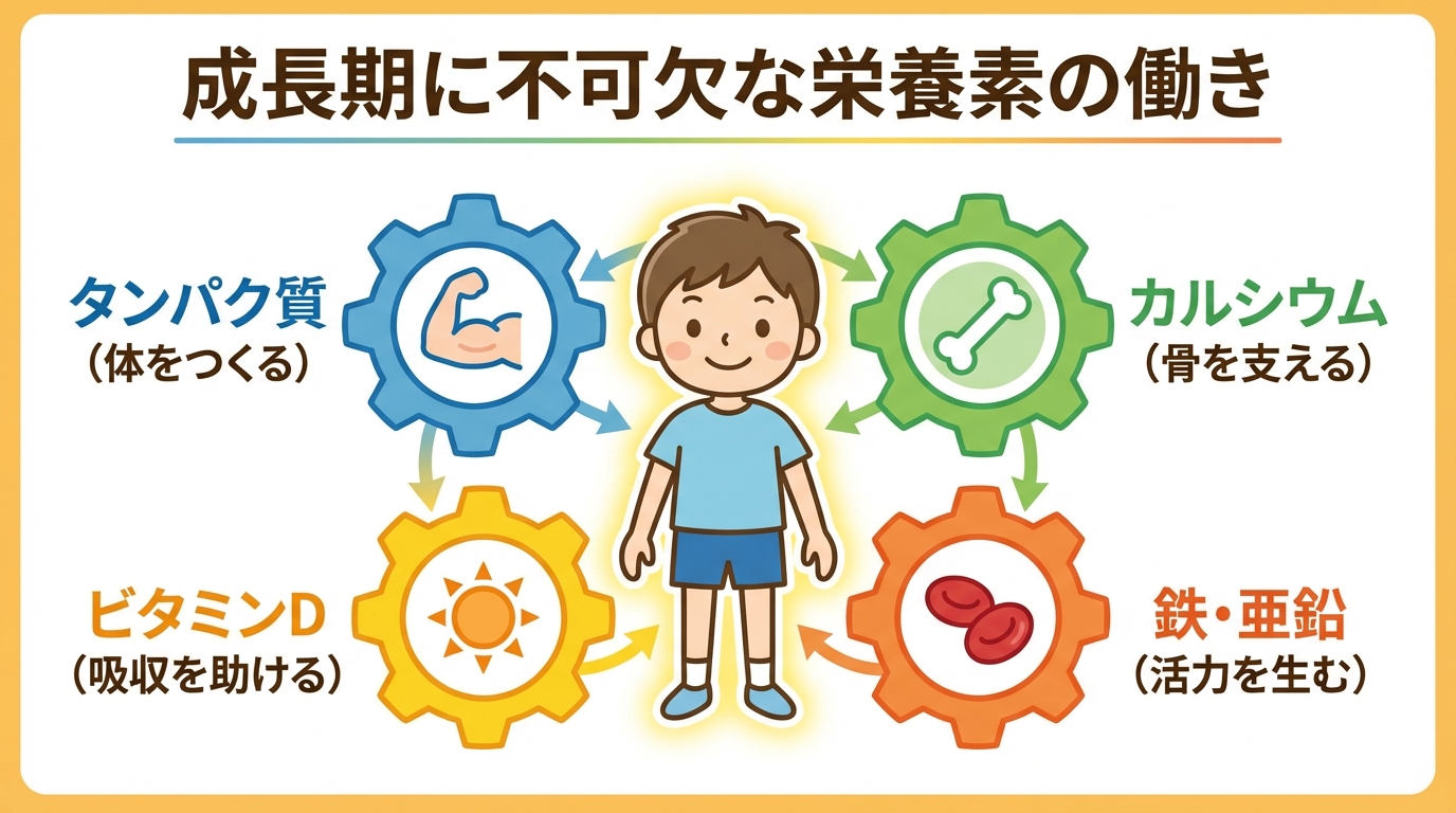 特定の食べ物だけで劇的に身体が大きくなる魔法の食材はありません。タンパク質、カルシウム、ビタミン、ミネラルをバランス良く摂取することが、子供の健やかな成長の土台となります。