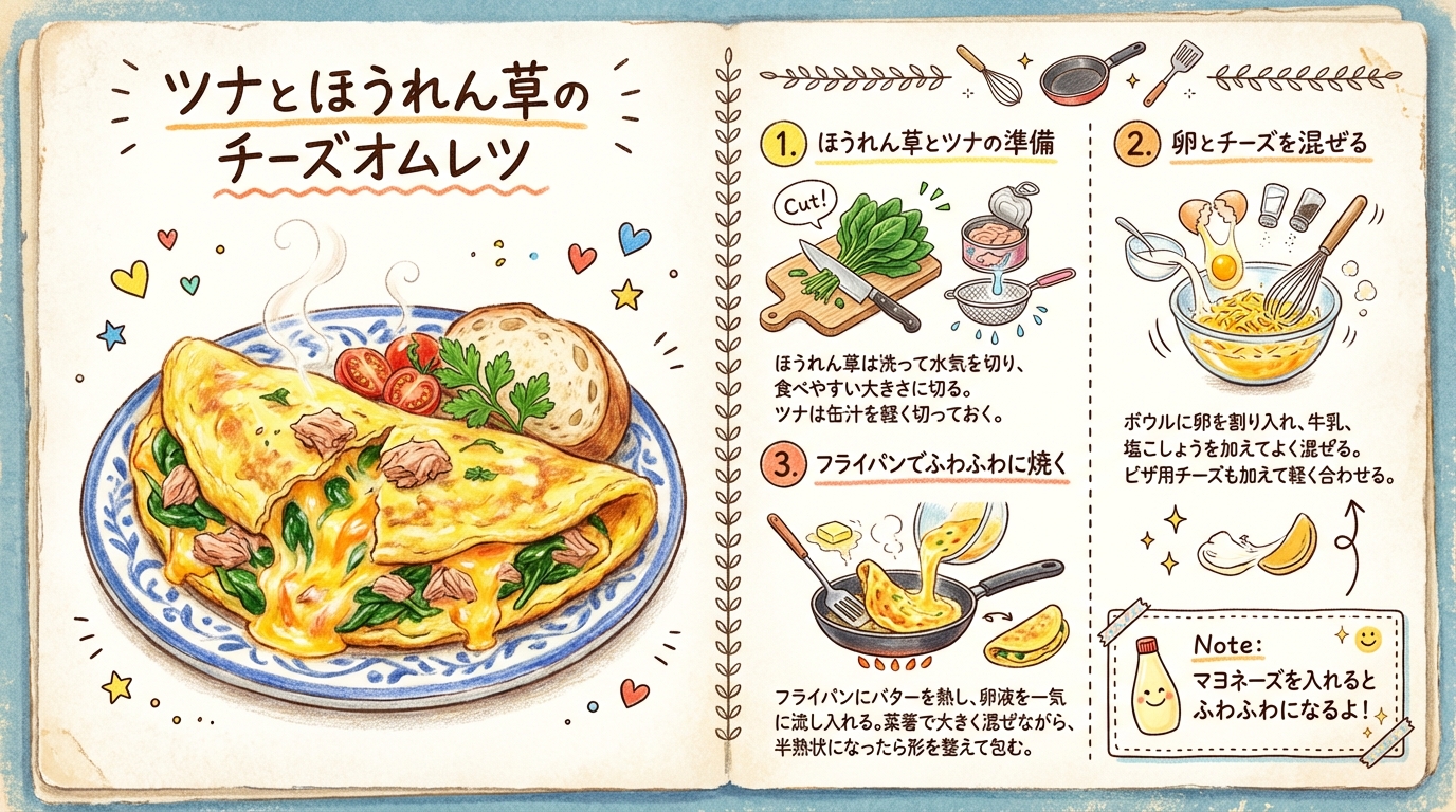 ほうれん草は下茹でして細かく刻み、ツナ缶は軽く油(または水気)を切っておきます。ボウルに卵を溶き、ほうれん草、ツナ、ピザ用チーズ、少量のマヨネーズを加えて混ぜ合わせ、フライパンでふんわりと焼き上げます。 - ポイント