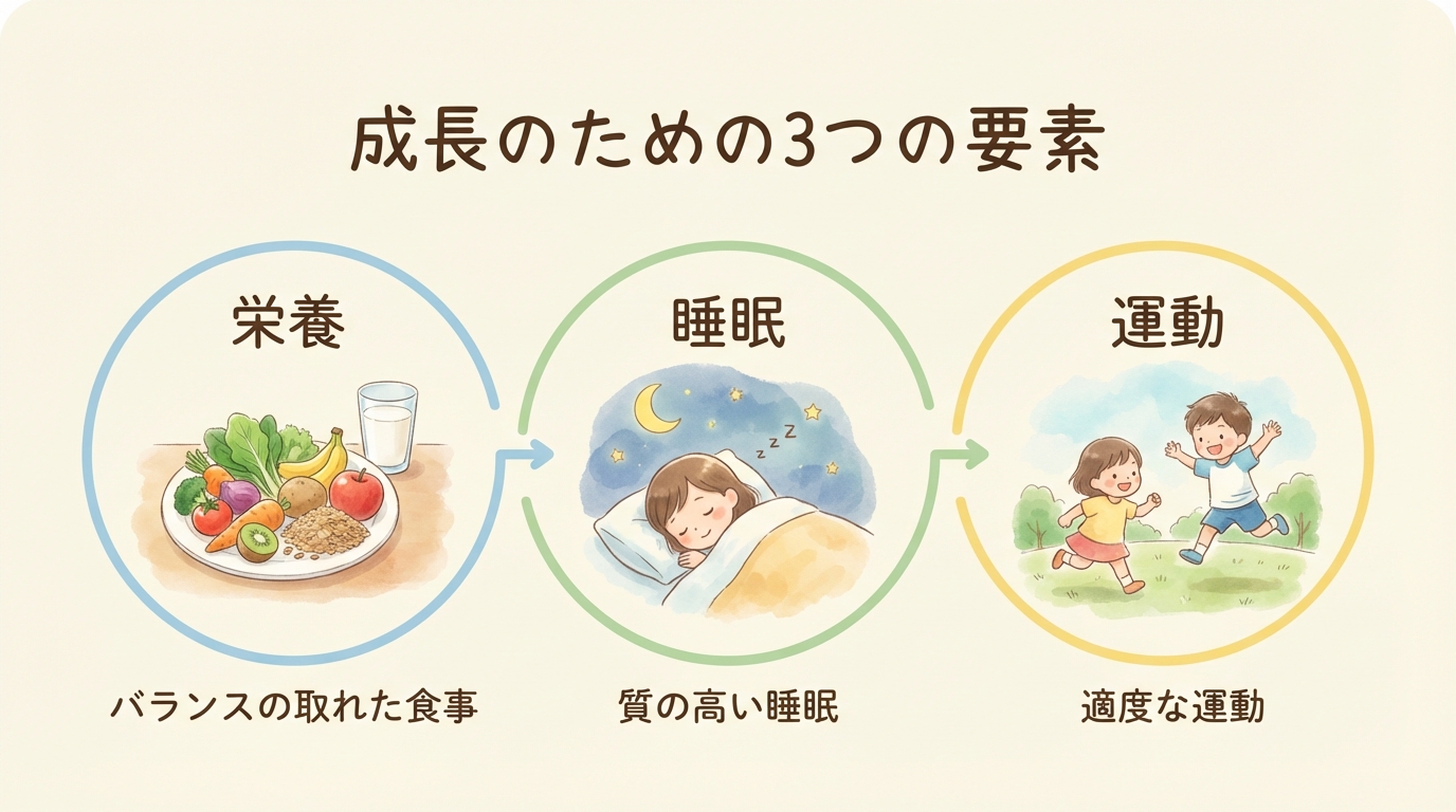 - 適度な運動:骨や筋肉に適度な刺激を与えることで、成長のサイクルがスムーズに回ります。