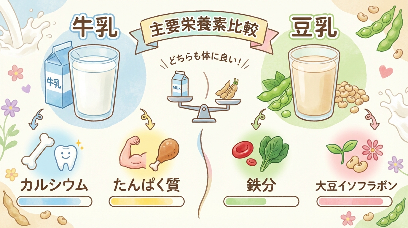牛乳と豆乳はどちらも成長期の体づくりをサポートする優秀な飲み物ですが、含まれる栄養素の特性が異なるため、目的に合わせて選ぶか、バランス良く取り入れることが推奨されています。