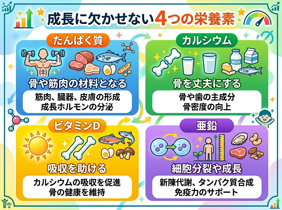 とくに重要なのが次の4つです。各栄養素の詳しい食材・摂取量については、関連記事「身長が伸びる食べ物と栄養素」をあわせてご参照ください。