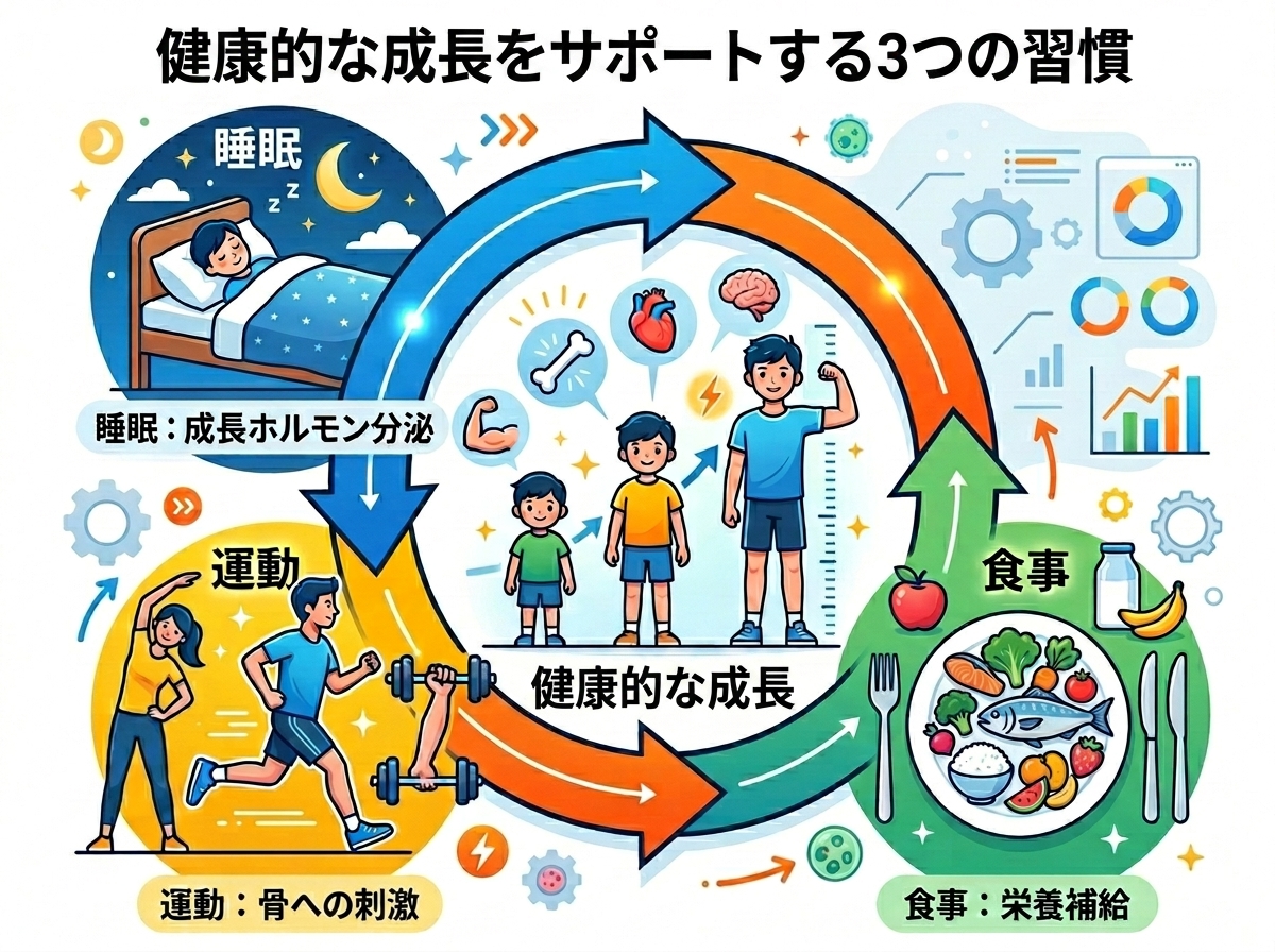 • 身長が伸びるのは骨端線が開いている成長期だけです。この限られた時期に、十分な栄養・睡眠・運動を確保することが成長の土台になります。