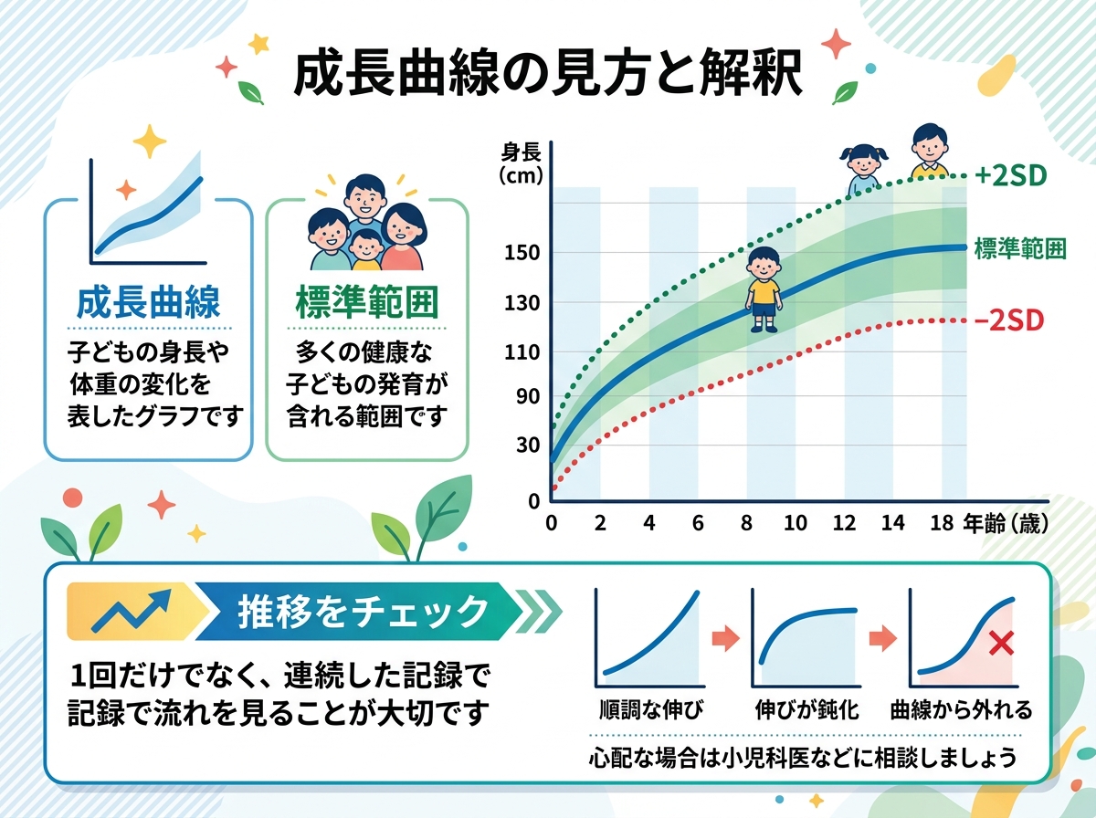 成長曲線で-2SD(標準偏差)以下に該当する場合や、成長率の明らかな低下が見られる場合は、小児科や低身長外来への受診を検討してください。
