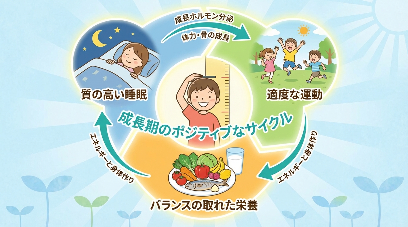 - 成長ホルモンの分泌を促す「質の高い睡眠」を確保することが重要です。
