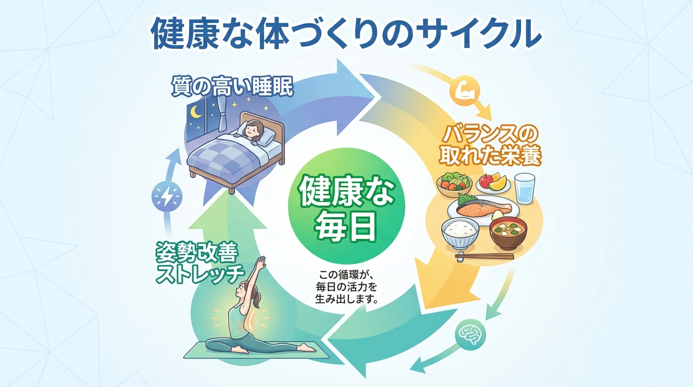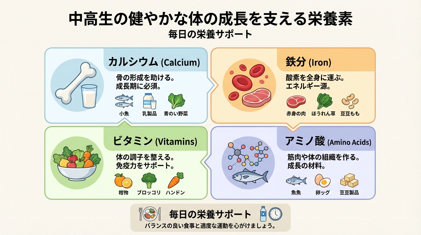 睡眠や運動の効果を最大限に引き出すためには、体をつくる「材料」となる栄養素が不可欠です。骨の主要な成分であるカルシウムだけでなく、その吸収を助けるビタミンD、筋肉や血液の材料となるタンパク質(アミノ酸)、鉄分などを毎日の食事から過不足なく摂取することが理想です。