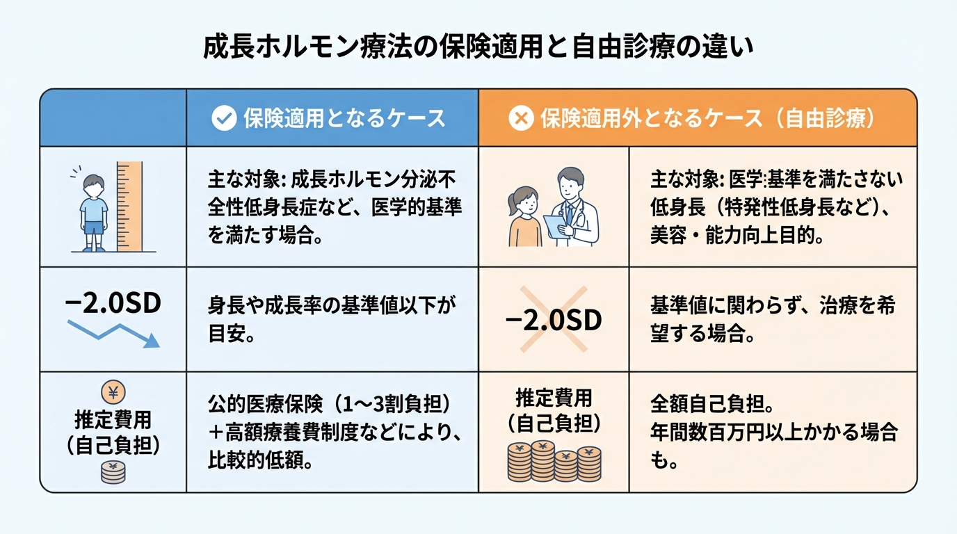 病院での治療を検討する際、多くの保護者の方が直面するのが費用の問題です。成長ホルモン治療は、国が定める厳格な基準を満たす特定の疾患と診断された場合のみ保険適用となり、それ以外は全額自己負担の自由診療となります。